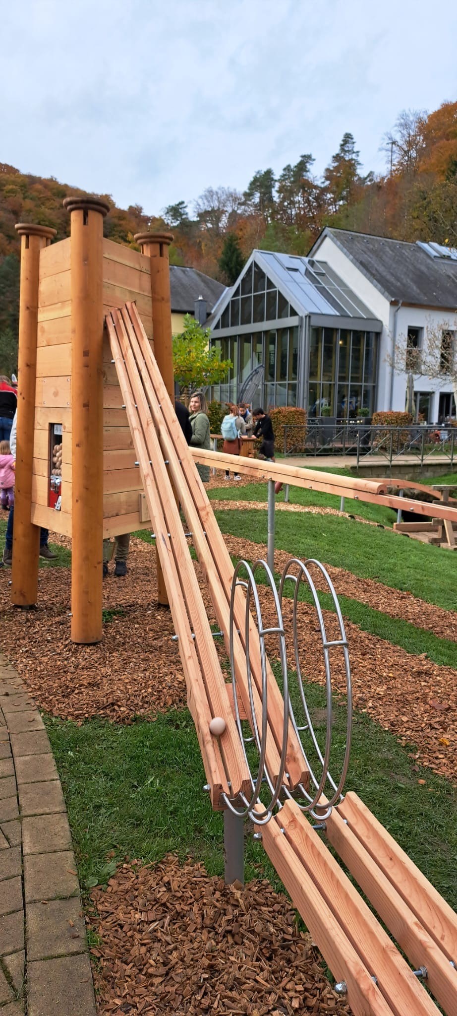 Sur la grande aire de jeux de Mullerthal, les enfants et les familles découvrent une attraction particulière : une piste à boules en bois, fabriquée avec soin à partir de bois local.